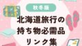 北海道旅行 【必需品】持ち物リンク集!北海道旅行に必要な持ち物をチェックリストで忘れない!(秋冬版) 北海道旅行に必要な持ち物・必需品のリンク集(秋冬版)北海道旅行の持ち物は、秋冬の季節によって大きく異なります。特に秋は気温差が激しいため重ね着で調整しやすい服装、冬は徹底した防寒と滑り止め付きの靴が必須です。以下の「北海道旅行 持ち物 秋冬... 2025.09.15 北海道旅行